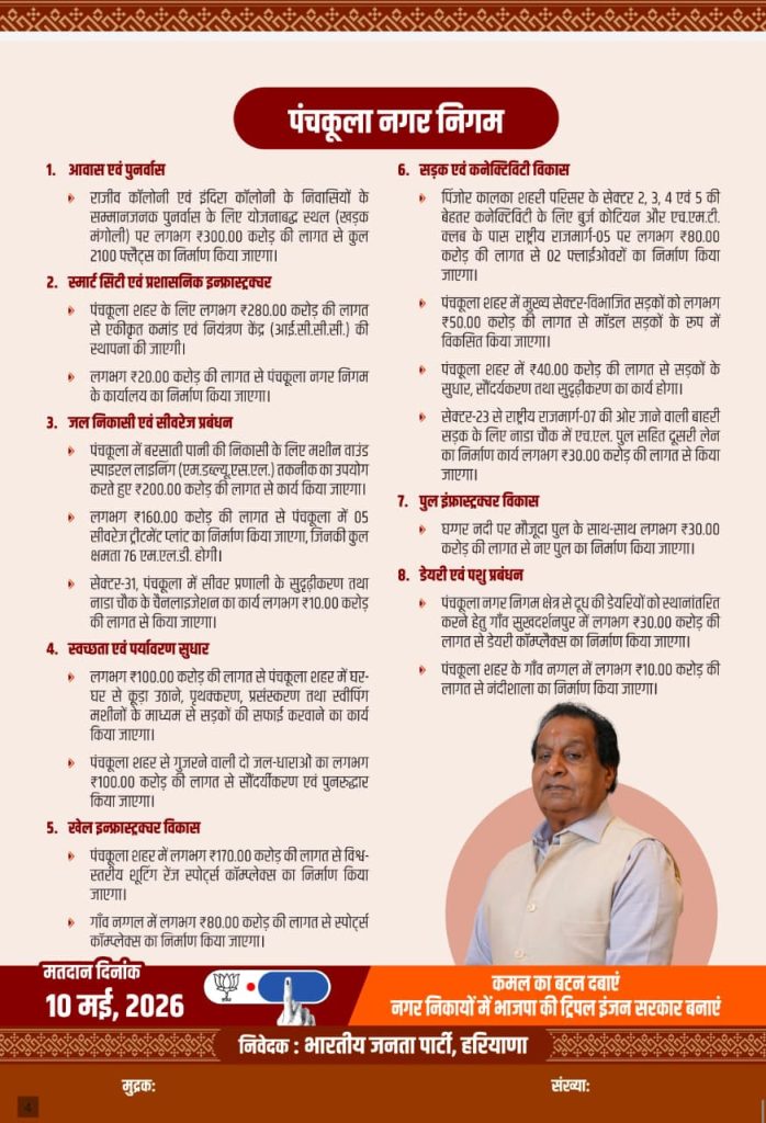 कृष्ण कुमार सैनी, चंडीगढ़। हरियाणा भाजपा ने निकाय चुनाव के लिए अपना संकल्प पत्र जारी कर दिया है, जिसमें शहरी विकास, नागरिक सुविधाओं और जनकल्याण से जुड़े 20 प्रमुख वादे किए गए हैं। पार्टी ने इसे शहरों की जरूरतों के अनुरूप तैयार किया गया विकास रोडमैप बताया है। संकल्प पत्र में महिलाओं को हाउस टैक्स में छूट, स्ट्रीट लाइट, बेहतर सीवर व्यवस्था, स्मार्ट सड़कें, पार्कों का विकास, व्यापारियों और छोटे कारोबारियों के लिए राहत जैसी घोषणाएं शामिल हैं।