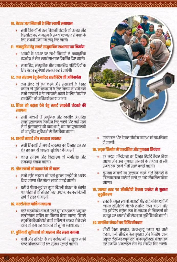 साथ ही, गरीब और मध्यमवर्गीय परिवारों के लिए प्रशासनिक और वित्तीय राहत देने की बात भी कही गई है। पार्टी ने नगर निकायों में ऑनलाइन सेवाओं, आधुनिक लाइब्रेरी, पार्कों में योग ज़ोन, पिंक टॉयलेट, दिव्यांगजनों के लिए सुविधाएं और सफाई व्यवस्था को मजबूत करने का भी वादा किया है।