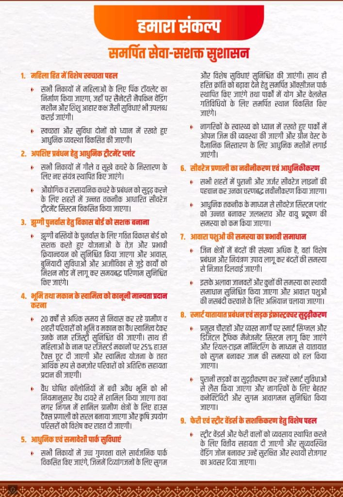 संकल्प पत्र में शहरी जीवन को अधिक सुरक्षित, स्वच्छ और सुविधाजनक बनाने पर विशेष जोर दिया गया है। भाजपा नेताओं का कहना है कि यह दस्तावेज़ प्रदेश में ट्रिपल इंजन सरकार की गति को और तेज करेगा तथा नगर निकायों को अधिक सक्षम और जवाबदेह बनाएगा। पार्टी ने इसे जनता से मिले सुझावों पर आधारित बताया है।
