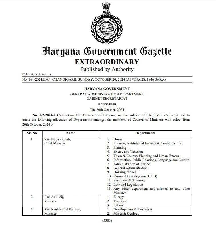 गृह और वित्त विभाग के अलावा मुख्यमंत्री नायब सिंह सैनी ने आबकारी एवं कराधान, योजना, नगर एवं ग्राम नियोजन और शहरी संपदा, सूचना, जनसंपर्क, भाषा एवं संस्कृति, न्याय प्रशासन, सामान्य प्रशासन, सभी के लिए आवास, आपराधिक जांच (CID), कार्मिक एवं प्रशिक्षण तथा कानून एवं विधायी विभाग भी अपने पास रखे हैं।