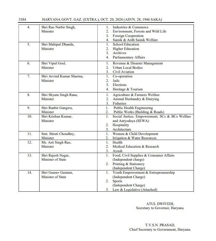 केंद्रीय मंत्री राव इंद्रजीत सिंह के बेटी आरती राव को स्वास्थ्य, राव नरबीर को उद्योग एवं पर्यावरण, अरविंद शर्मा को जेल और किरण चौधरी की बेटी श्रुति चौधरी को महिला एवं बाल विकास विभाग दिया गया है। जबकि कृष्ण लाल पंवार विकास एवं पंचायत और माइन्स, महिपाल ढ़ांढा को एजुकेशन, विपुल गोयल को रेवेन्यू विभाग दिया गया है।