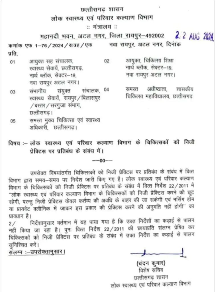 दरअसल, 22 अगस्त 2024 को लोक स्वास्थ्य एवं परिवार कल्याण विभाग के विशेष सचिव चंदन कुमार ने एक आदेश जारी कर साफ किया था कि सरकारी डॉक्टरों को केवल ड्यूटी समय के बाद, और वह भी सिर्फ अपने निजी चेंबर या निवास पर ही प्रैक्टिस करने की अनुमति होगी. आदेश में यह भी स्पष्ट रूप से लिखा गया था कि किसी भी निजी अस्पताल, नर्सिंग होम या क्लीनिक में OPD/IPD सेवाएं देना पूरी तरह प्रतिबंधित रहेगा.