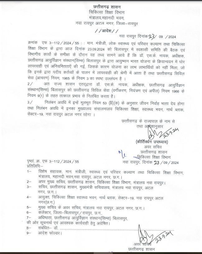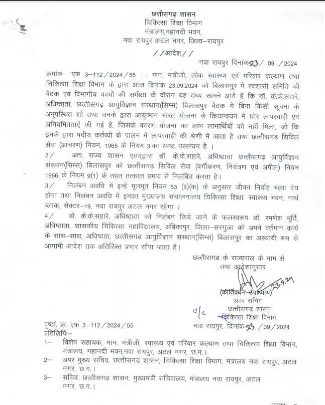 सत्या राजपूत, रायपुर। बिलासपुर सिम्स की अधिशाषी समिति की बैठक में स्वास्थ्य मंत्री श्याम बिहारी जायसवाल शामिल हुए। स्वास्थ्य मंत्री जायसवाल सिम्स प्रबंधन की कार्यशैली से नाराज हुए और प्रबंधन को फटकार लगाई। उन्होंने लापरवाही बरतने पर डीन डॉ. केके सहारे और एमएस डॉ. एसके नायक को सस्पेंड करने के निर्देश दिए।
