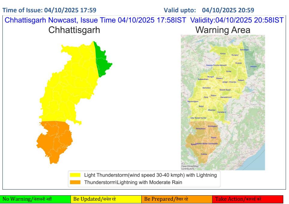 मौसम विभाग के मुताबिक, सुकमा, बीजापुर, दंतेवाड़ा, बस्तर, नारायणपुर, कोंडागांव और कांकेर में गरज-चमक और तेज हवा (30-40 KMPH) के साथ मध्यम वर्षा की संभावना है.