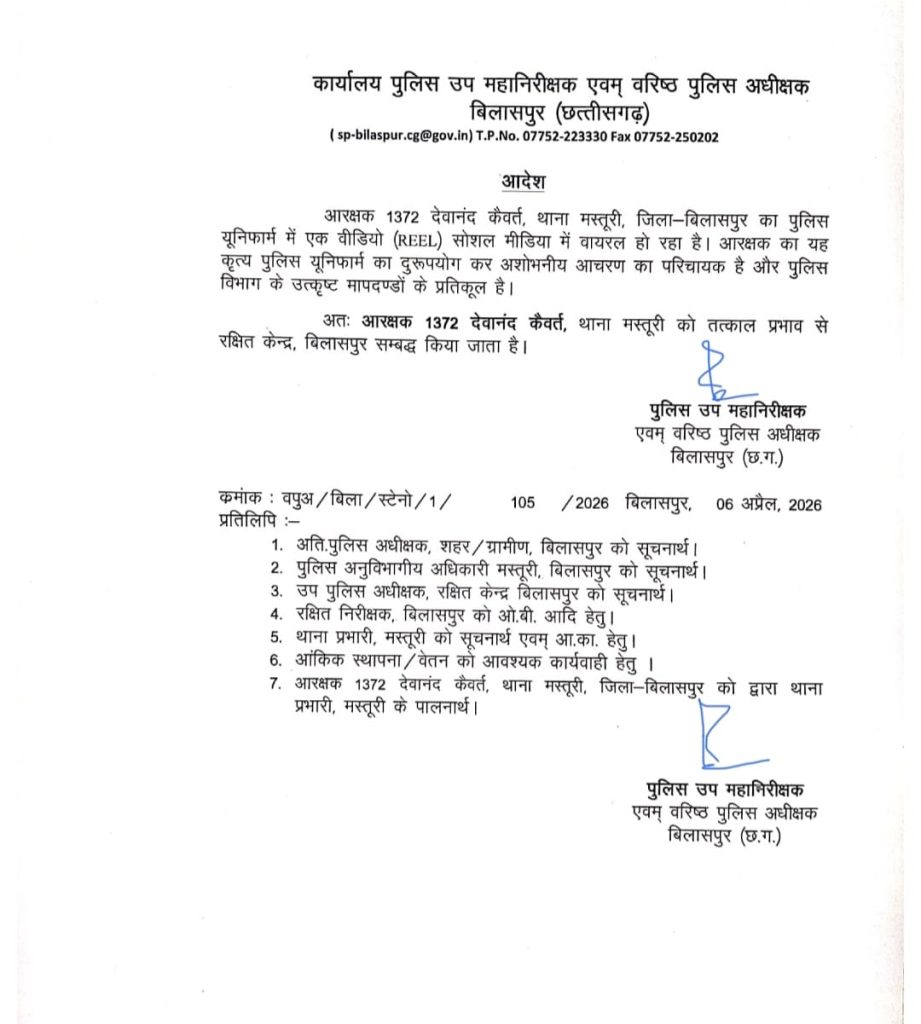 यह मामला बिलासपुर का है, जहां आरक्षक देवानंद कैवर्त ने पुलिस यूनिफॉर्म में रील बनाकर उसे सोशल मीडिया पर पोस्ट कर दिया। वीडियो सामने आने के बाद इसे यूनिफॉर्म के दुरुपयोग और अशोभनीय आचरण माना गया। जैसे ही वीडियो वायरल हुआ, वरिष्ठ अधिकारियों ने तुरंत संज्ञान लिया। मामले को गंभीरता से लेते हुए एसएसपी रजनेश सिंह ने आदेश जारी कर आरक्षक देवानंद कैवर्त को मस्तूरी थाने से हटाकर रक्षित केंद्र, बिलासपुर अटैच कर दिया। यह आदेश तत्काल प्रभाव से लागू कर दिया गया है।