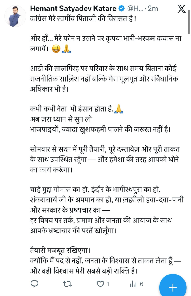 अपनी पोस्ट में कटारे ने लिखा कि कांग्रेस मेरे स्वर्गीय पिताजी की विरासत है ! और हाँ… मेरे फोन न उठाने पर कृपया भारी-भरकम क़यास ना लगायें। शादी की सालगिरह पर परिवार के साथ समय बिताना कोई राजनीतिक साज़िश नहीं बल्किरा मूलभूत और संवैधानिक अधिकार भी है। कभी कभी नेता भी इंसान होता है. अब ज़रा ध्यान से सुन लो भाजपाइयों, ज़्यादा खुशफहमी पालने की जरूरत नहीं है।