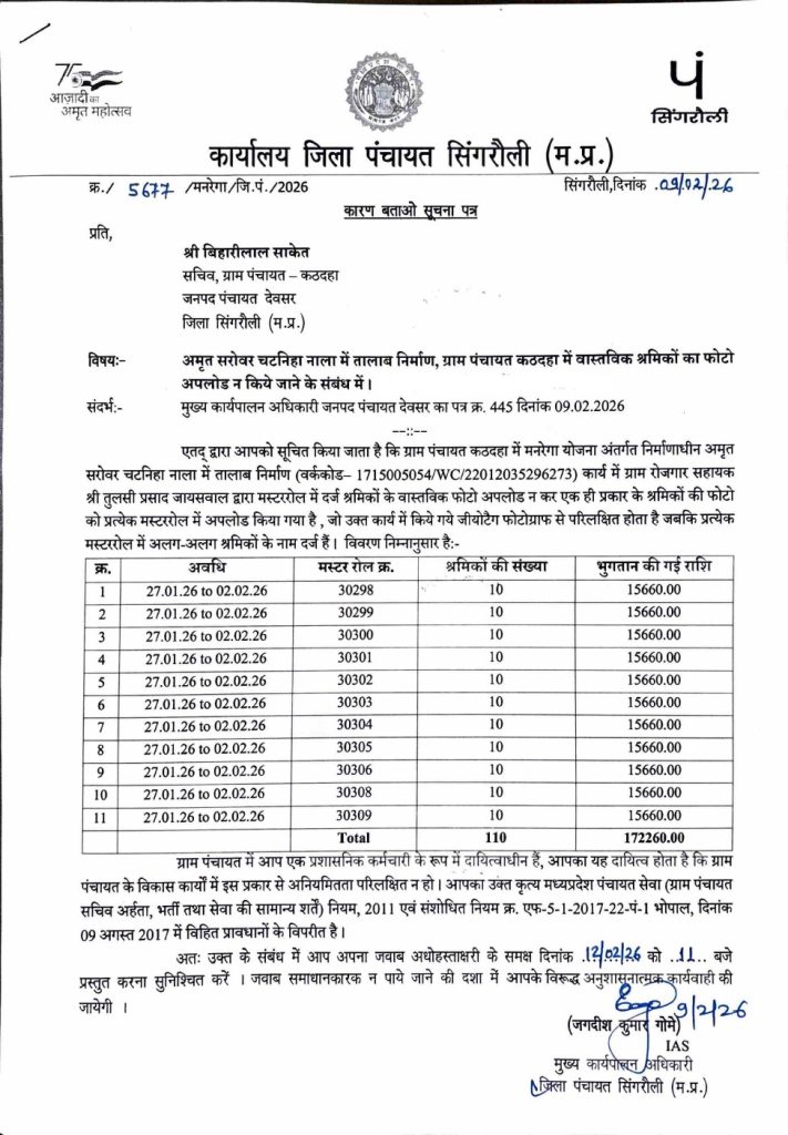 सुरेश पांडेय, सिंगरौली। देवसर जनपद की कठदहा पंचायत में जी राम जी योजना में भ्रष्टाचार का मामला सामने आया है। मामले में जिला पंचायत सीईओ ने 9 फरवरी को पांच लोगों को नोटिस जारी की और 12 तारीख तक जवाब मांगा पर आज दिनांक तक कार्रवाई के नाम पर सिर्फ कागजी खानापूर्ति की गई है। लोगों में चर्चा है कि क्या ऐसे में भ्रष्टाचार खत्म होगा। अब देखना है कि क्या नोटिस से ही काम चलेगा कि दोषियों पर गाज गिरेगी