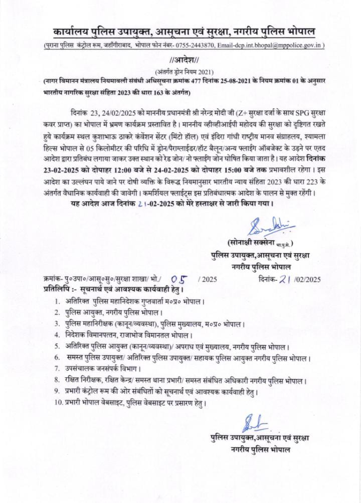 राजधानी के ये तीन लोकेशन- मानव संग्रहालय, कुशाभाऊ ठाकरे कन्वेंशन सेंटर और श्यामला हिल्स समेत 5 किलोमीटर के दायरे में ड्रोन उड़ाने पर प्रतिबंध होगा। जेट प्लस सिक्योरिटी और एसपीजी के निर्देश पर पुलिस उपायुक्त ने इसके आदेश जारी कर दिए हैं।