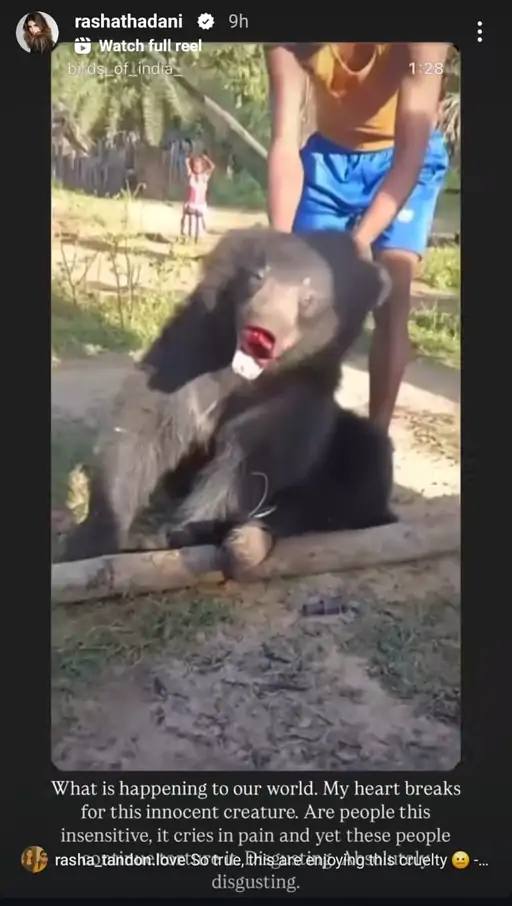 भालू की पिटाई का दर्दनाक वीडियो अब सोशल मीडिया पर तेजी से वायरल हो रहा है। इस वीडियो को बॉलीवुड एक्ट्रेस रवीना टंडन की बेटी राशा टंडन ने भी अपने सोशल मीडिया अकाउंट पर साझा किया था। राशा ने लिखा “लोग इतने असंवेदनशील कैसे हो सकते हैं? लोग पीट रहे हैं, भालू दर्द से तड़प रहा है और ये लोग मजा ले रहे हैं। ये बहुत घिनौना है।”