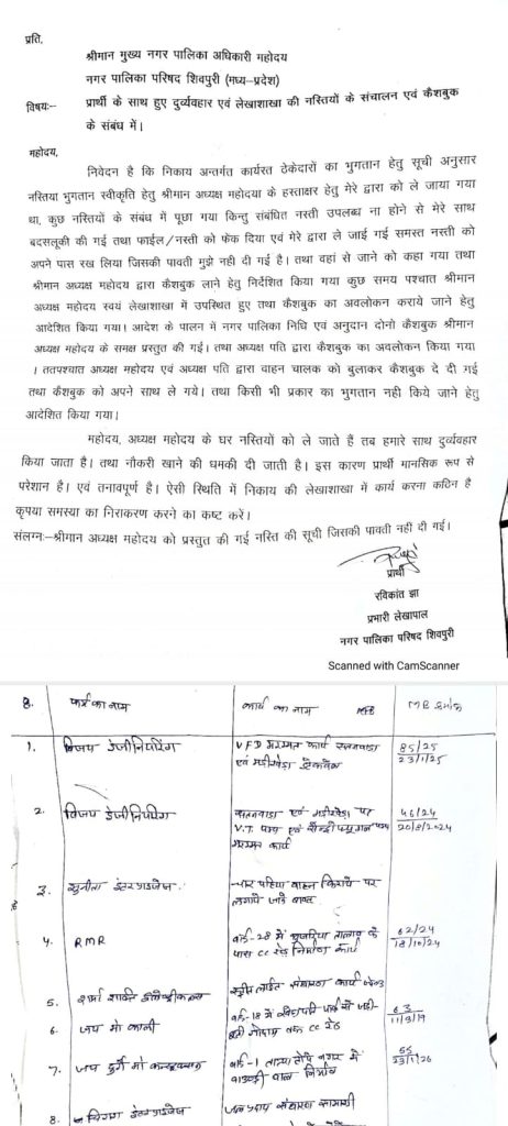 परवेज खान, शिवपुरी। भ्रष्टाचार के आरोप झेल रही नगर पालिका अध्यक्ष एवं अध्यक्ष पति की दबंगई सामने आई है। दोनों अध्यक्ष और अध्यक्ष पति ने अकाउंटेंट से अभद्रता कर कैशबुक व अन्य फाइल अपने साथ ले गए। इस दौरान सीएमओ को लेकर भला बुरा कहा। घटना सीसीटीवी कैमरे में कैद हो गई है।