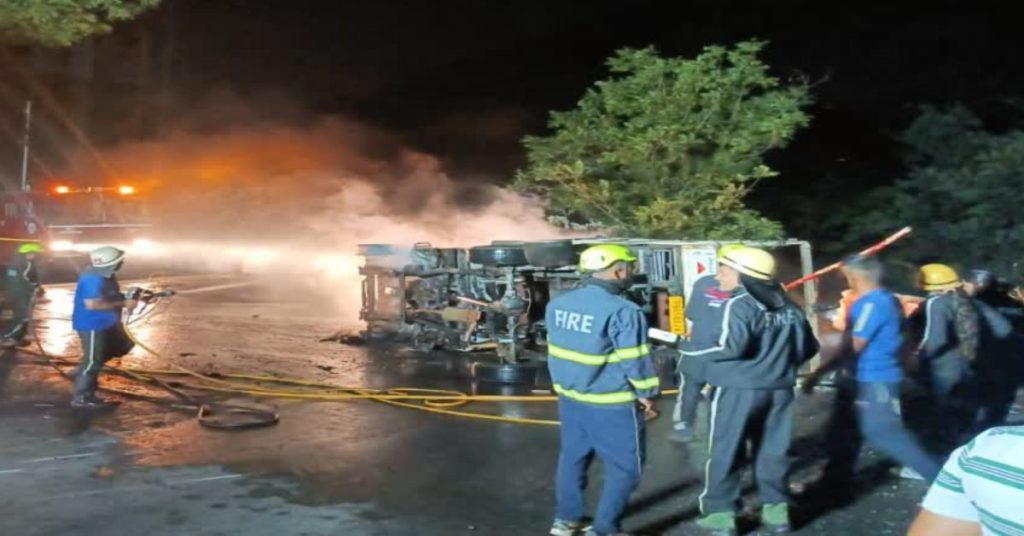 मसूरी. कोलूखेत के पास शनिवार रात सड़क हादसा हो गया. जिसमें एक ट्रक अनियंत्रित होकर सड़क पर पलट गया. ट्रक में आग लग गई. घटना की सूचना मिलते ही मसूरी पुलिस, फायर सर्विस और एम्बुलेंस मौके पर पहुंची. जिसके पहले आग पर काबू पाया गया. इधर दुर्घटना के चलते सड़क पर जाम लग गया. बाद में जिसे हटवाया गया.