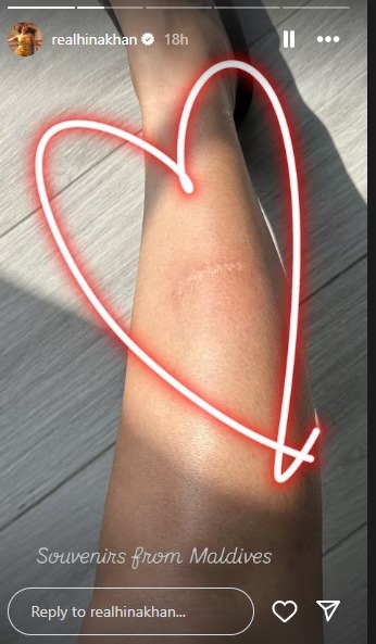 बता दें कि कैंसर के इलाज के बीच हिना खान (Hina Khan) मालदीव में वेकेशन एन्जॉय कर रही हैं. हाल ही में एक्ट्रेस ने इंस्टा स्टोरी पर एक तस्वीर शेयर की है, जिसमें उनके पैर पर चोट के निशान नजर आ रहा है. इस तस्वीर को स्टोरी पर शेयर करते हुए हिना ने लिखा- मालदीव से मिली निशानी. Read More – Bhool Bhulaiyaa 3 का नया पोस्टर आया सामने, दीवाली पर खुलेगा तंत्र और मंत्र के साथ बंधा दरवाजा …
