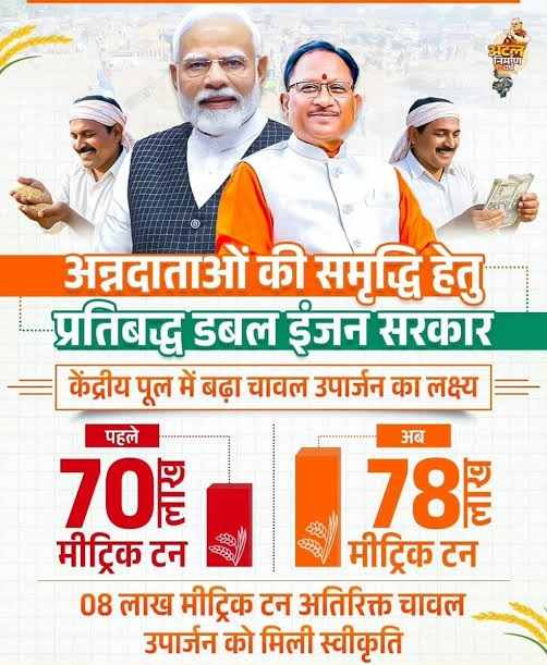 वर्ष 2000 में छत्तीसगढ़ का कुल धान उत्पादन – लगभग 65 लाख टन वहीं साय सरकार में वर्ष 2025 में धान उत्पादन – 140 लाख टन से अधिक दर्ज। धान खरीदी केंद्र में आने वाला कुल धान जो पहले कुछ सौ टन मगर राज्य में साय सरकार आने के बाद अब 2500 से अधिक दर्ज की गई है। राज्य में PDS के लाभार्थी वर्तमान में 2.5 करोड़ से अधिक हो गए हैं। छत्तीसगढ़ देश के सबसे बड़े चावल आपूर्तिकर्ता राज्यों में शामिल हो गया है। मुख्यमंत्री खाद्यान्न योजना और छत्तीसगढ खाद्य एवं पोषण सुरक्षा अधिनियम लागू होने के बाद पीडीएस का कवरेज 45 प्रतिशत से बढ़कर 82 प्रतिशत हुआ।