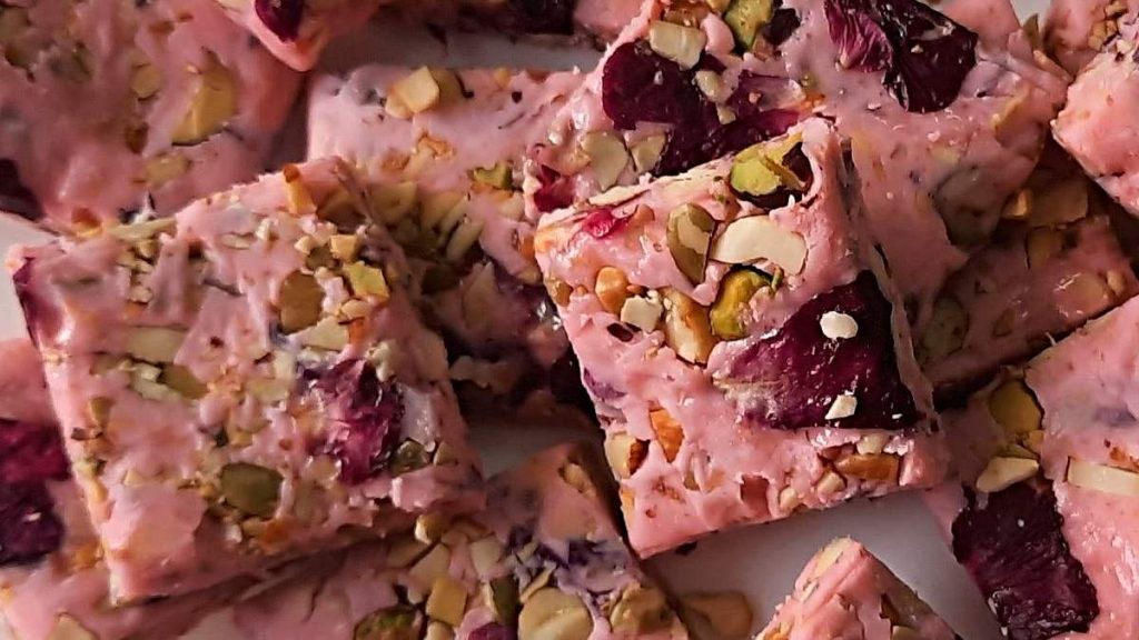 - जब बर्फी सेट हो जाए, तो ऊपर से कटे हुए पिस्ता और गुलाब की पंखुड़ियों से सजाएं.