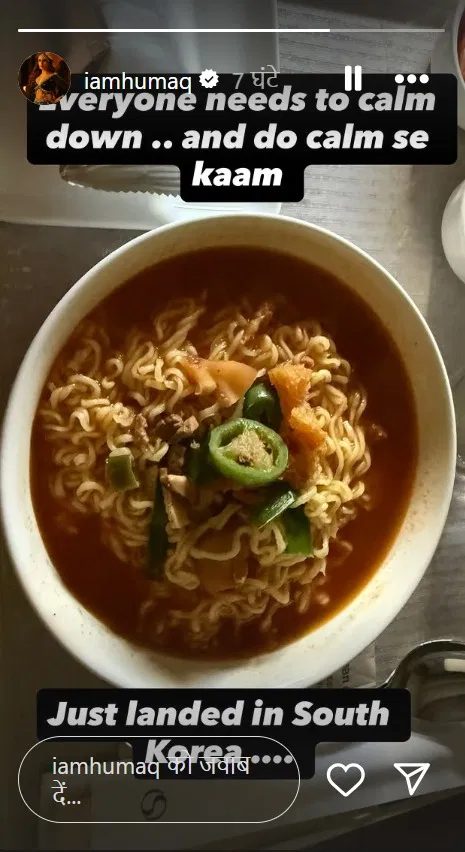 एक्ट्रेस हुमा कुरैशी (Huma Qureshi) ने अपने इस पोस्ट के साथ कैप्शन में लिखा- ‘सभी लोगों को शांत रहने की जरूरत है और अपने काम से काम रखो. साउथ कोरिया में लैंडिंग हो गई’. ये फोटो फ्लाइट के खाने की है. शेयर किए गए फोटो में एक बाउल में सूपी नूडल्स दिखाई दे रहा हैं.