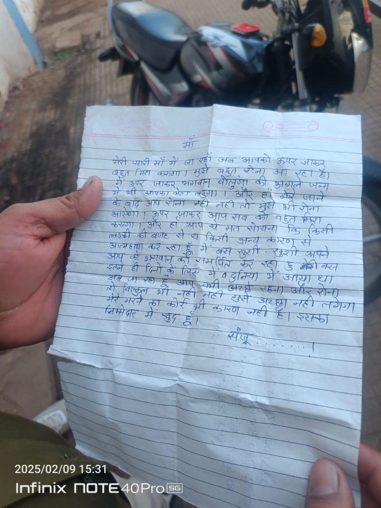 जानकारी के अनुसार मृतक की पहचान संजय मेहर उर्फ संजू के रूप में हुई है। पुलिस को मृतक के पास से सुसाइड नोट मिला। जिसमें लिखा है कि, मैं खुशी-खुशी अपने आप को भगवान को समर्पित कर रहा हूं। यह मत सोचना मैंने लड़की के कारण से सुसाइड किया है। आप सब रोना मत, नहीं तो ऊपर भी मुझे रोना आएगा। मृतक ने खुदकुशी के लिए खुद को जिम्मेदार बताया।