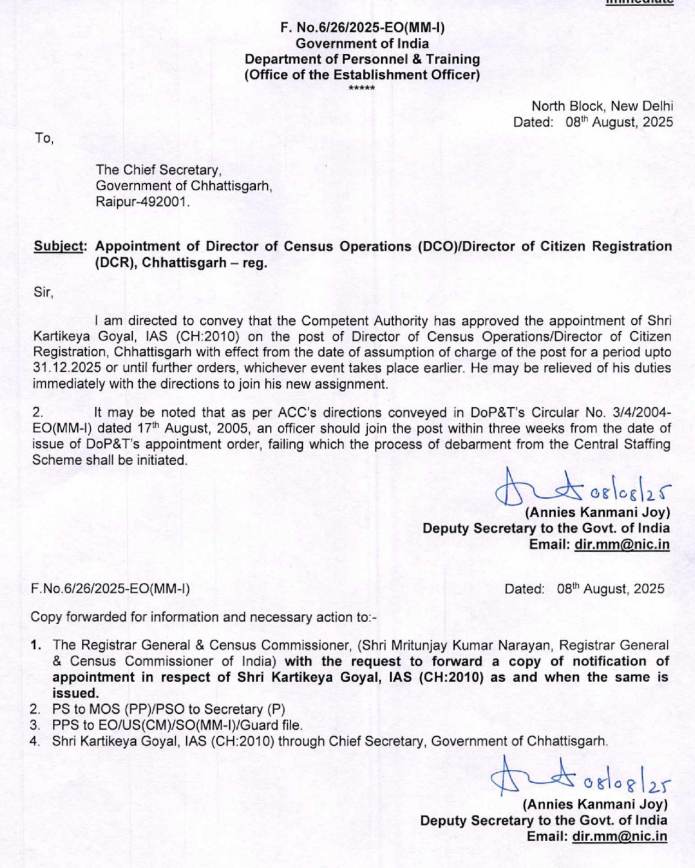 रायपुर। केंद्र सरकार ने भारतीय प्रशासनिक सेवा के अफसर कार्तिकेय गोयल को छत्तीसगढ़ के लिए जनगणना संचालक नियुक्त किया है। गोयल जाति जनगणना के प्रभार पर भी रहेंगे। आईएएस कार्तिकेय गोयल वर्ष-2010 बैच के अफसर हैं और खाद्य संचालक के पद पर हैं।