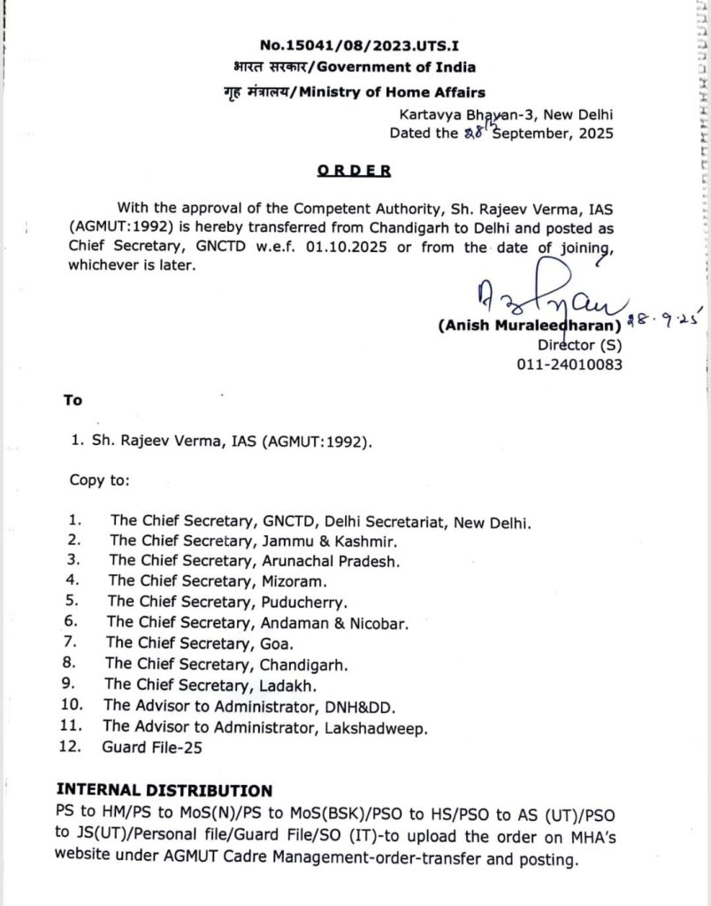 गृह मंत्रालय ने रविवार शाम एक आधिकारिक आदेश जारी कर एजीएमयूटी कैडर के 1992 बैच के आईएएस अधिकारी राजीव वर्मा को दिल्ली का नया मुख्य सचिव नियुक्त किया है। आदेश के मुताबिक, वर्मा को चंडीगढ़ से दिल्ली ट्रांसफर किया गया है। वह 1 अक्तूबर 2025 से या कार्यभार ग्रहण करने की तिथि से राष्ट्रीय राजधानी क्षेत्र दिल्ली सरकार (GNCTD) के मुख्य सचिव का पद संभालेंगे। वर्तमान मुख्य सचिव धर्मेंद्र 30 सितंबर को सेवानिवृत्त हो रहे हैं, जिसके बाद वर्मा यह जिम्मेदारी संभालेंगे।