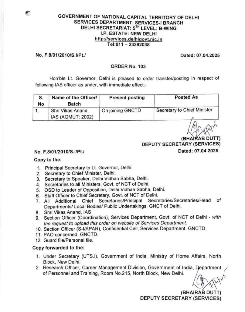 Delhi: 2002 बैच IAS ऑफिसर विकास आनंद को दिल्ली की मुख्यमंत्री रेखा गुप्ता (Rekha Gupta) का सचिव नियुक्त किया गया है. AGMUT कैडर के आईएएस अधिकारी आनंद यूपी के रहने वाले है. सोमवार (7 अप्रैल 2025) को दिल्ली सरकार ने इसका आदेश जारी किया. इससे पहले विकास आनंद कई गृह मंत्रालय समेत केंद्र में कई पदों पर सेवा दे चुके हैं.