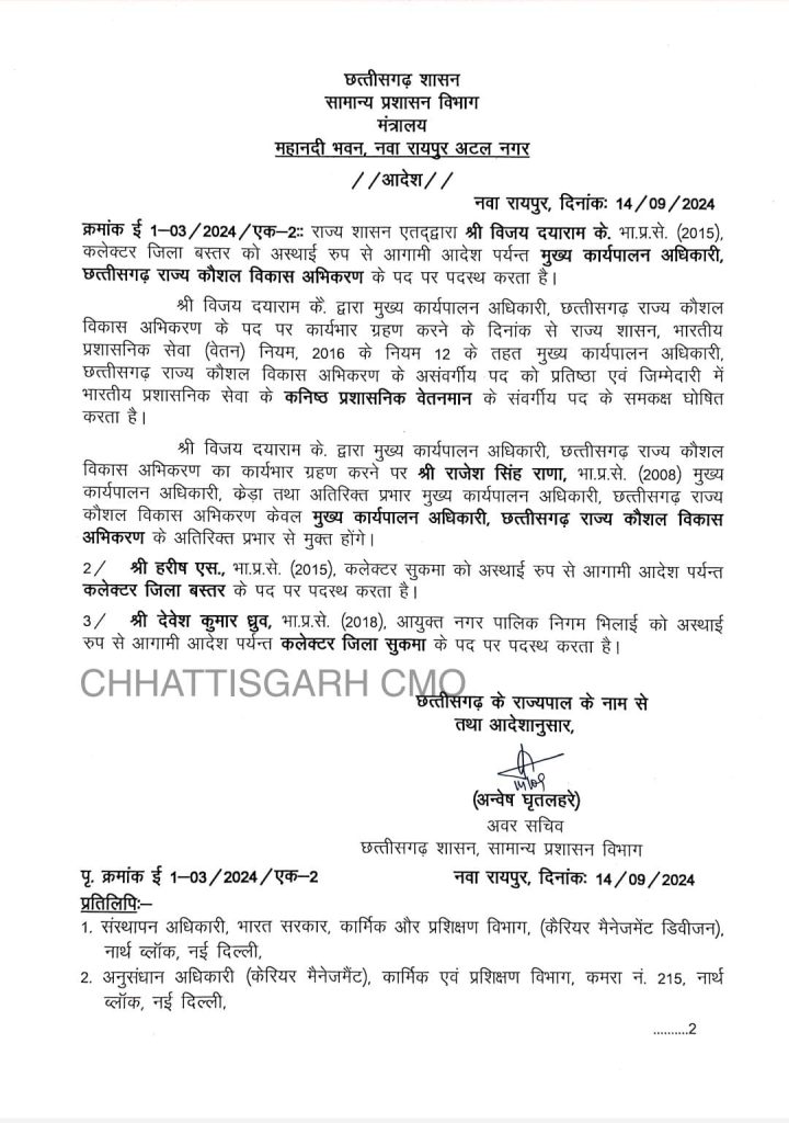 रायपुर। कलेक्टर-एसपी कांफ्रेंस के बाद राज्य शासन ने बस्तर कलेक्टर को हटा दिया है. उच्च पदस्थ आधिकारिक सूत्रों के मुताबिक़ बस्तर कलेक्टर के परफ़ॉर्मेंस से सरकार संतुष्ट नहीं थी, लिहाजा कांफ्रेंस ख़त्म होने के दूसरे दिन ही कलेक्टर विजय दयाराम के का तबादला कर दिया गया. उन्हें छत्तीसगढ़ राज्य कौशल विकास अभिकरण के सीईओ की जिम्मेदारी सौपी गई है. वहीं उनकी जगह सुकमा कलेक्टर रहे हरीश एस को बस्तर कलेक्टर बनाया गया है, जबकि सुकमा कलेक्टर के रूप में देवेश कुमार ध्रुव की पदस्थापना की गई है. इससे पहले देवेश ध्रुव भिलाई नगर निगम कमिश्नर के रूप में कार्य कर रहे थे.