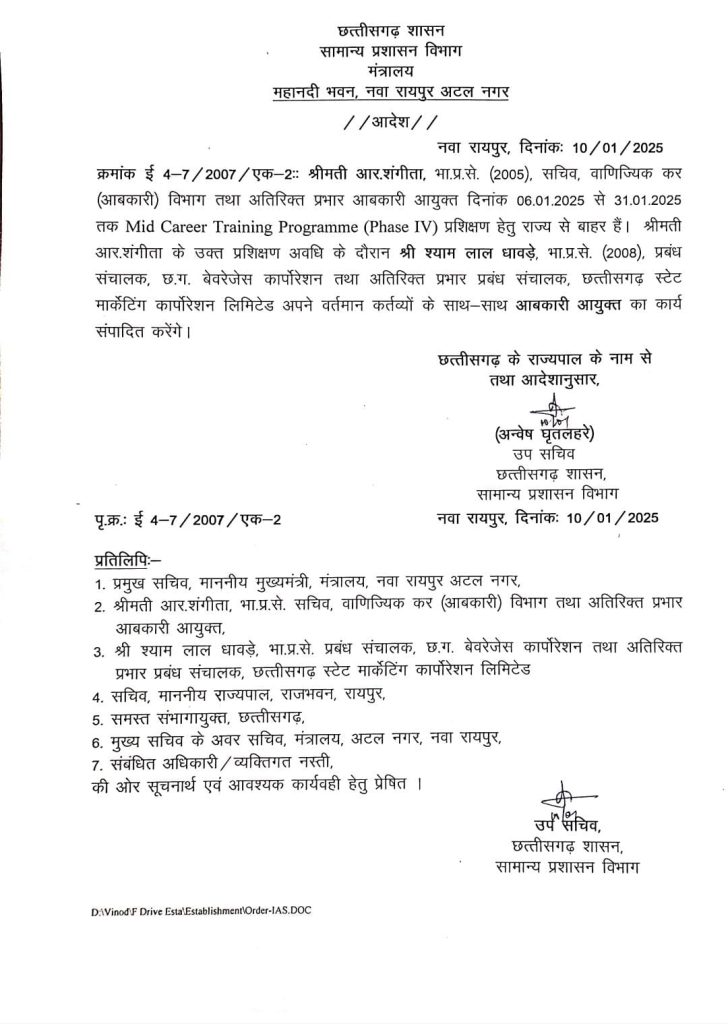 रायपुर. छत्तीसगढ़ ब्रेवरेज कॉरपोरेशन के प्रबंध संचालक आईएएस श्याम लाल धावड़े को आबकारी आयुक्त की अतिरिक्त जिम्मेदारी दी गई है. उन्हें यह जिम्मेदारी आबकारी आयुक्त आर संगीता के मिड करियर ट्रेनिंग प्रोग्राम में शामिल होने के लिए राज्य से बाहर जाने की वजह से दी गई है. आर संगीता की ट्रेनिंग अवधि तक धावड़े यह अतिरिक्त प्रभार संभालेंगे.
