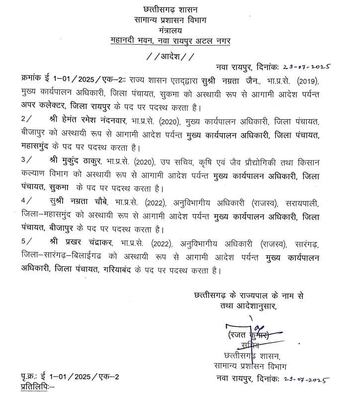 आईएएस हेमंत रमेश नंदनवार मुख्य कार्यपालन अधिकारी जिला पंचायत बीजापुर को मुख्य कार्यपालन अधिकारी जिला पंचायत महासमुंद के पद पर पदस्थ किया गया है. आईएएस मुकुंद ठाकुर उप सचिव कृषि एवं जैव प्रौद्योगिकी तथा किसान कल्याण विभाग को मुख्य कार्यपालन अधिकारी जिला पंचायत सुकमा, आईएएस नम्रता चौबे अनुविभागीय अधिकारी (राजस्व) सरायपाली जिला महासमुंद को मुख्य कार्यपालन अधिकारी जिला पंचायत बीजापुर और आईएएस प्रखर चंद्राकर अनुविभागीय अधिकारी (राजस्व) सारंगढ़ जिला सारंगढ़-बिलाईगढ को मुख्य कार्यपालन अधिकारी जिला पंचायत गरियाबंद के पद पर पदस्थ किया गया है.