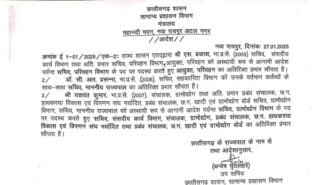 IAS Transfer News : रायपुर. राज्य सरकार ने भारतीय प्रशासनिक अधिकारियों के प्रभार में फेरबदल किया है. सामान्य प्रशासन विभाग द्वारा जारी आदेश के मुताबिक आईएएस एस प्रकाश को वर्तमान कर्तव्यों के साथ-साथ आयुक्त परिवहन विभाग का अतिरिक्त प्रभार सौंपा गया है. इसके अलावा आईएएस सी आर प्रसन्ना को वर्तमान कर्तव्यों के साथ-साथ राज्यपाल के सचिव का अतिरिक्त प्रभार सौंपा गया है.