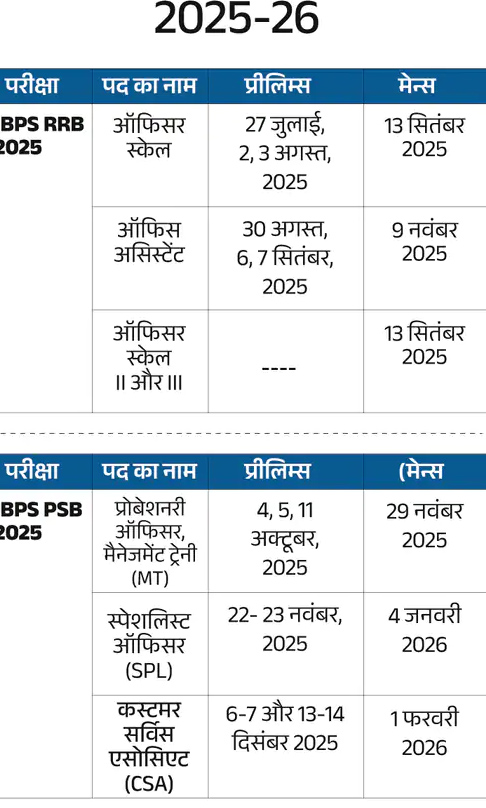 IBPS प्रोबेशनरी ऑफिसर्स/मैनेजमेंट ट्रेनी प्रारंभिक परीक्षा 4 अक्टूबर, 5 अक्टूबर और 11 अक्टूबर, 2025 को होगी; मुख्य परीक्षा 29 नवंबर, 2025 को होगी. विशेषज्ञ अधिकारियों (एसपीएल) के लिए प्रारंभिक परीक्षा 22 और 23 नवंबर, 2025 को होगी, जबकि मुख्य परीक्षा 4 जनवरी, 2026 को होगी. ग्राहक सेवा सहयोगियों (CSSA) के लिए प्रारंभिक परीक्षा 6, 7, 13 और 14 दिसंबर को होगी, और CSSA के लिए मुख्य परीक्षा 1 फरवरी, 2026 को होगी.