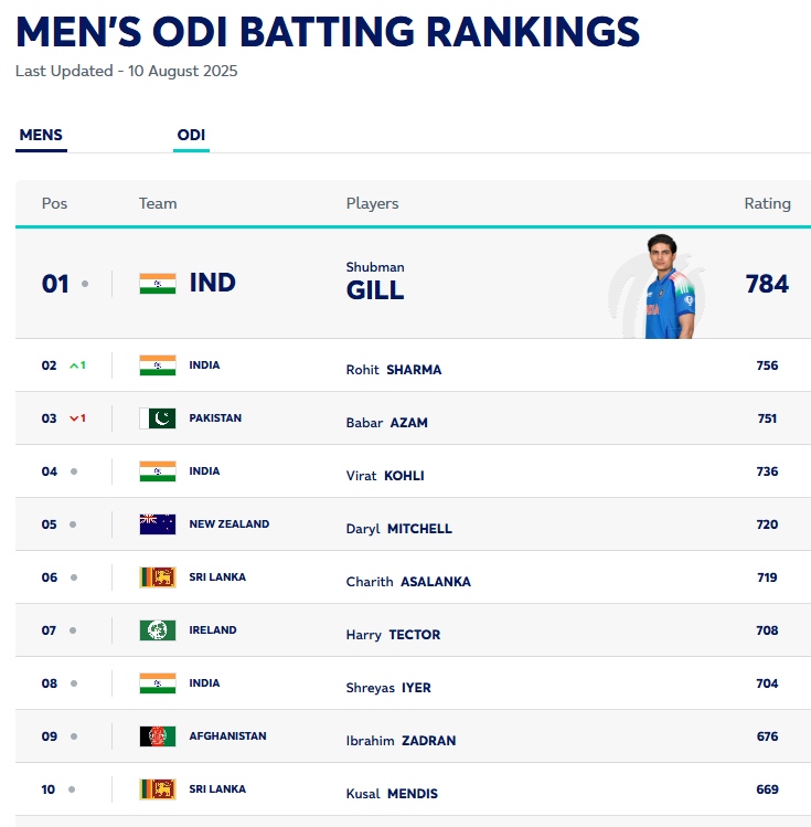 वनडे बल्लेबाजों की लिस्ट में शुभमन गिल पहले नंबर पर हैं, उनके 784 रेटिंग पॉइंट्स हैं। रोहित शर्मा ने पिछले 5 महीनों से कोई इंटरनेशनल मैच नहीं खेला है, उनका आखिरी मैच 9 मार्च 2025 को न्यूजीलैंड के खिलाफ चैंपियंस ट्रॉफी फाइनल में था। अगर बाबर का प्रदर्शन इसी तरह कमजोर रहा तो जल्द ही विराट कोहली भी उन्हें पीछे कर सकते हैं।
