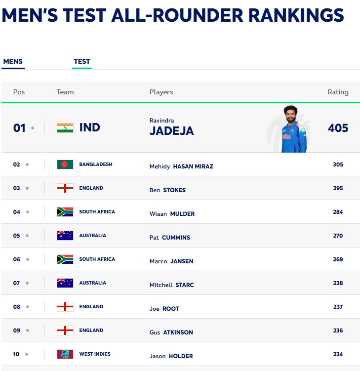 रवींद्र जडेजा लगातार 179 हफ्तों से नंबर-1 टेस्ट ऑलराउंडर बने हुए हैं। उनके पास 405 रेटिंग पॉइंट्स हैं और टॉप-10 ऑलराउंडर्स में कोई बदलाव नहीं हुआ है।