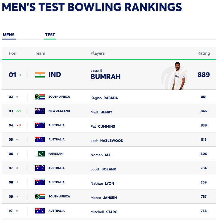 वहीं जसप्रीत बुमराह टेस्ट गेंदबाजी रैंकिंग में नंबर-1 बने हुए हैं। न्यूजीलैंड के गेंदबाज मैट हेनरी ने एक स्थान की बढ़त के साथ 846 रेटिंग पॉइंट्स के साथ नंबर-3 पर कब्जा किया। हेनरी ने ऑस्ट्रेलिया के कप्तान पैट कमिंस (838 अंक) को पीछे छोड़ा और अपने करियर बेस्ट रेटिंग पॉइंट्स हासिल किए हैं। उन्होंने हाल ही में जिम्बाब्वे के खिलाफ 16 विकेट भी लिए।