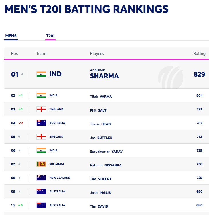 साउथ अफ्रीका के खिलाफ पहले टी-20 में टिम डेविड ने 83 रनों की विस्फोटक पारी खेली और 6 स्थान की छलांग लगाकर 10वें स्थान पर पहुंच गए। यह उनकी करियर की बेस्ट टी-20 रैंकिंग है। भारत के अभिषेक शर्मा 829 रेटिंग पॉइंट्स के साथ नंबर-1 हैं, जबकि तिलक वर्मा (804 रेटिंग पॉइंट्स) इंग्लैंड के फिल सॉल्ट (791 पॉइंट्स) को पीछे छोड़ते हुए नंबर-2 पर आ गए हैं।