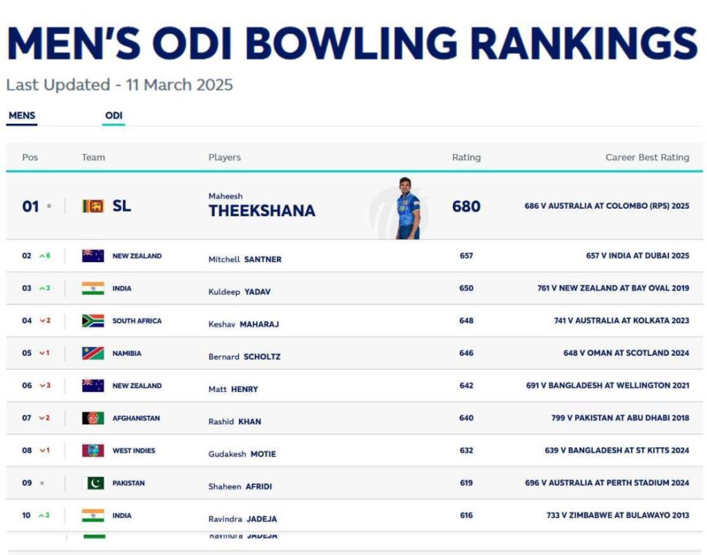 न्यूजीलैंड के डेरिल मिशेल को एक स्थान का फायदा हुआ है। वे अब 721 रेटिंग पॉइंट के साथ छठे स्थान पर चले गए हैं। आयरलैंड के हैरी टेक्टर एक पायदान नीचे गिरकर नंबर 7 पर चले गए हैं। चैंपियंस ट्रॉफी 2025 में भारत की ओर से सबसे ज्यादा रन बनाने वाले श्रेयस अय्यर 8वें स्थान पर बरकरार हैं। श्रीलंका के चरिथ असलंका 694 की रेटिंग के साथ नंबर 9 पर बने हुए हैं। अफगानिस्तान के इब्राहिम जादरान 676 रेटिंग पॉइंट के साथ 10वें नंबर पर हैं।