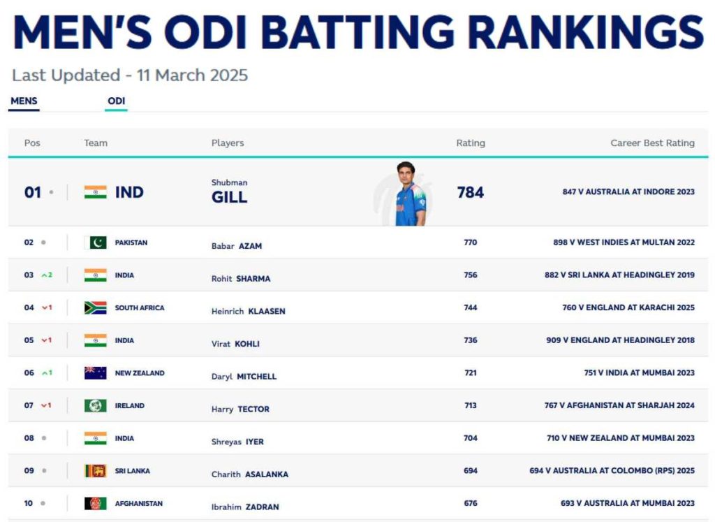 भारत के युवा सलामी बल्लेबाज शुभमन गिल शीर्ष पर कब्जा जमाए हुए हैं। उनकी रेटिंग 784 है। पाकिस्तान के स्टार बल्लेबाज बाबर आजम नंबर दो पर जमे हुए हैं।