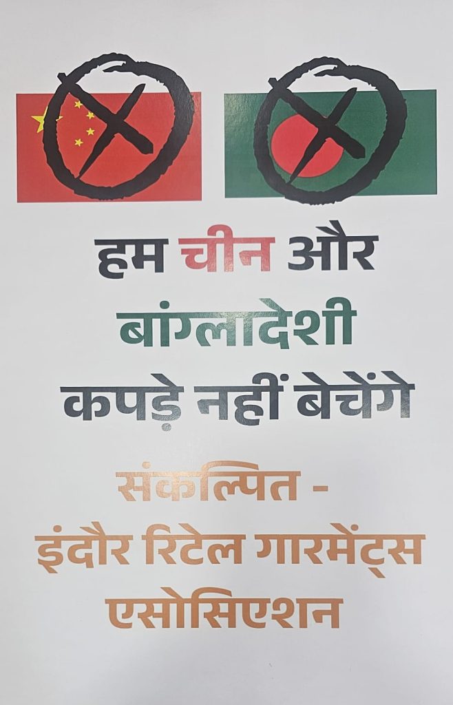 हेमंत शर्मा, इंदौर। मध्य प्रदेश के इंदौर में कपड़ा बाजार में इन दिनों एक अनोखी मुहिम चर्चा में है। रिटेल गारमेंट्स एसोसिएशन ने संकल्प लिया है कि वे अब अपनी दुकानों पर चीन और बांग्लादेश में बने कपड़े नहीं बेचेंगे। इस संकल्प को सार्वजनिक करते हुए व्यापारियों ने अपनी दुकानों पर बड़े-बड़े पोस्टर लगाए हैं, जिन पर लिखा है”हम चीन और बांग्लादेशी कपड़े नहीं बेचेंगे, यह हमारा संकल्प है।”