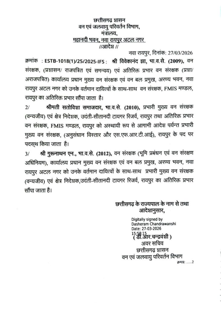 सतोविशा समाजदार (2010 बैच) को अस्थायी रूप से प्रभारी मुख्य वन संरक्षक (अनुसंधान, विस्तार एवं एफआरटीआई), रायपुर के पद पर पदस्थ किया गया है. साथ ही, गुरुनाथन एन. (2012 बैच) को उनके वर्तमान दायित्वों के साथ प्रभारी मुख्य वन संरक्षक (वन्यजीव) एवं क्षेत्र निदेशक, उदंती-सीतानदी टाइगर रिजर्व, रायपुर का अतिरिक्त प्रभार सौंपा गया है.