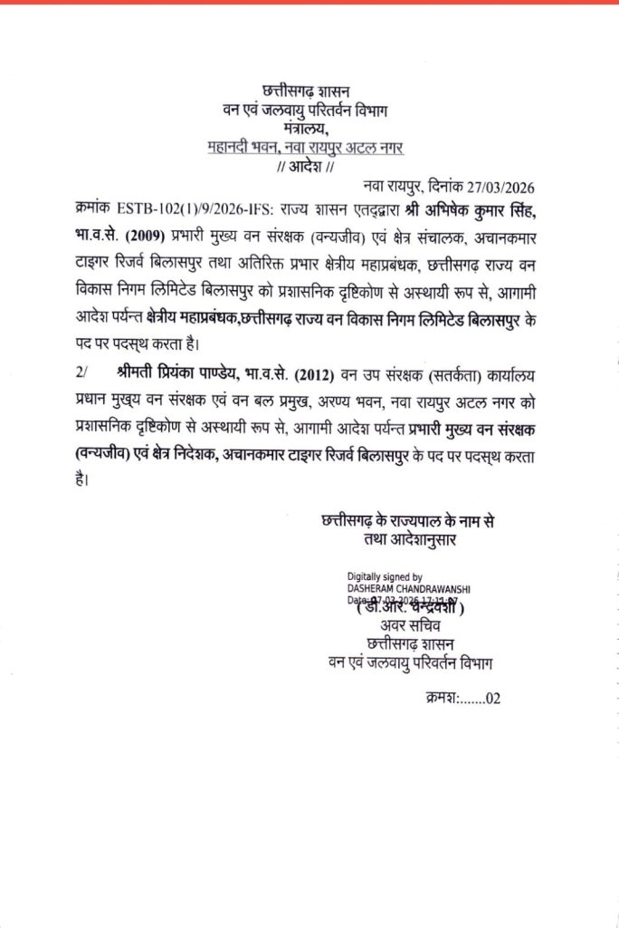 27 मार्च को जारी आदेश के अनुसार, आईएफएस अधिकारी अभिषेक कुमार सिंह (2009 बैच) को क्षेत्रीय महाप्रबंधक, छत्तीसगढ़ राज्य वन विकास निगम लिमिटेड, बिलासपुर के पद पर पदस्थ किया गया है. वे वर्तमान में अचानकमार टाइगर रिजर्व, बिलासपुर में क्षेत्र संचालक के रूप में कार्यरत हैं. वहीं विवेकानंद झा (2009 बैच) को उनके वर्तमान कार्यों के साथ वन संरक्षक, FMIS मंडल, रायपुर का अतिरिक्त प्रभार दिया गया है.