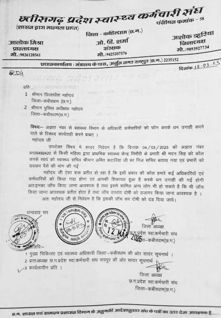 प्रदीप गुप्ता, कवर्धा। स्वास्थ्य विभाग के सचिव अमित कटारिया का पर्सनल सेक्रेटरी बताते हुए जिले के स्वास्थ्य केंद्रों में पदस्थ डॉक्टरों और कर्मचारियों से अवैध वसूली का मामला सामने आया है. मामले में छत्तीसगढ़ प्रदेश स्वास्थ्य कर्मचारी संघ की ओर से सीएमएचओ के साथ पुलिस अधीक्षक से लिखित शिकायत की है. यह भी पढ़ें : खनिज क्षेत्र में पारदर्शिता और नवाचार का नया अध्याय: 44 खनिज ब्लॉकों की सफल ई-नीलामी, राज्य सरकार को मिला 11 हजार 581 करोड़ का खनिज राजस्व