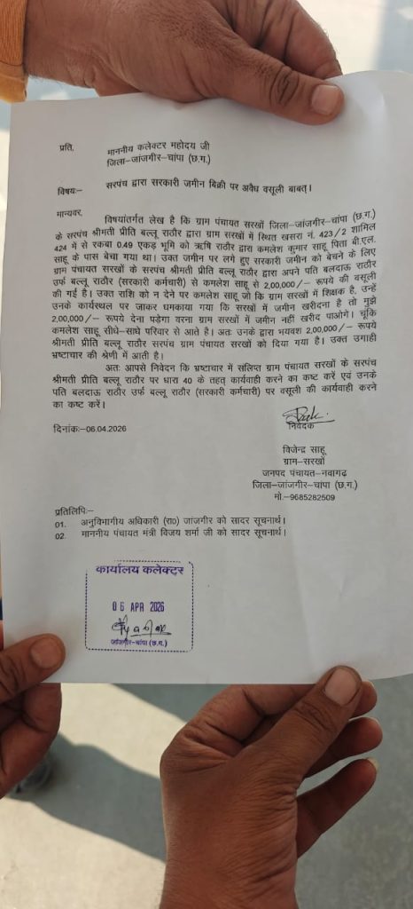 प्रशांत सिंह, जांजगीर-चांपा। जिले में सरकारी जमीन की खरीद फरोख्त का मामला सामने आया है। आरोप है कि ग्रामीण क्षेत्र में इस अवैध कारोबार को सरपंच और उनके पति संचालित कर रहे हैं। ताजा मामला सरखों ग्राम पंचायत का है। इसकी शिकायत ग्रामीण विजेंद्र साहू ने कलेक्टर से शिकायत कर मामले में कार्रवाई की मांग की है।