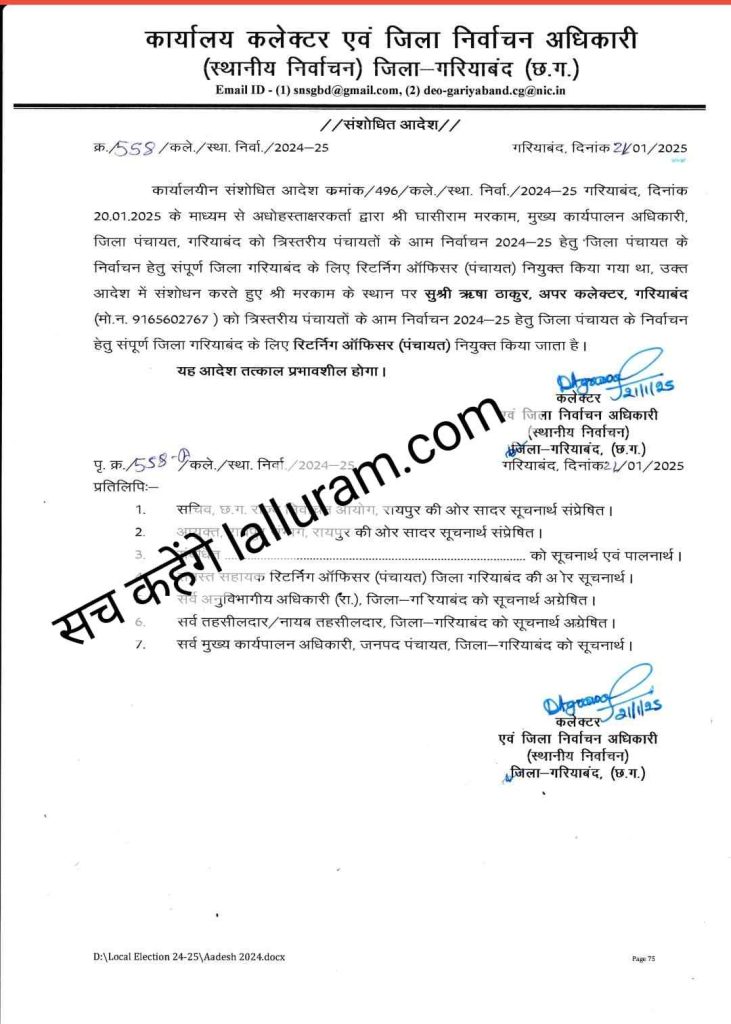 कलेक्टर एवं जिला निर्वाचन अधिकारी की ओर से जारी आदेश में कहा गया है कि घासीराम मरकाम, मुख्य कार्यपालन अधिकारी, जिला पंचायत गरियाबंद को त्रिस्तरीय पंचायतों के आम निर्वाचन 2024-25 के तहत जिला पंचायत के निर्वाचन के लिए संपूर्ण जिला गरियाबंद के लिए रिटर्निंग ऑफिसर (पंचायत) नियुक्त किया गया था. उक्त आदेश में संशोधन करते हुए मरकाम के स्थान पर ऋषा ठाकुर, अपर कलेक्टर गरियाबंद को त्रिस्तरीय पंचायतों के आम निर्वाचन 2024-25 हेतु जिला पंचायत के निर्वाचन के लिए संपूर्ण जिला गरियाबंद के लिए रिटर्निंग ऑफिसर (पंचायत) नियुक्त किया गया है.