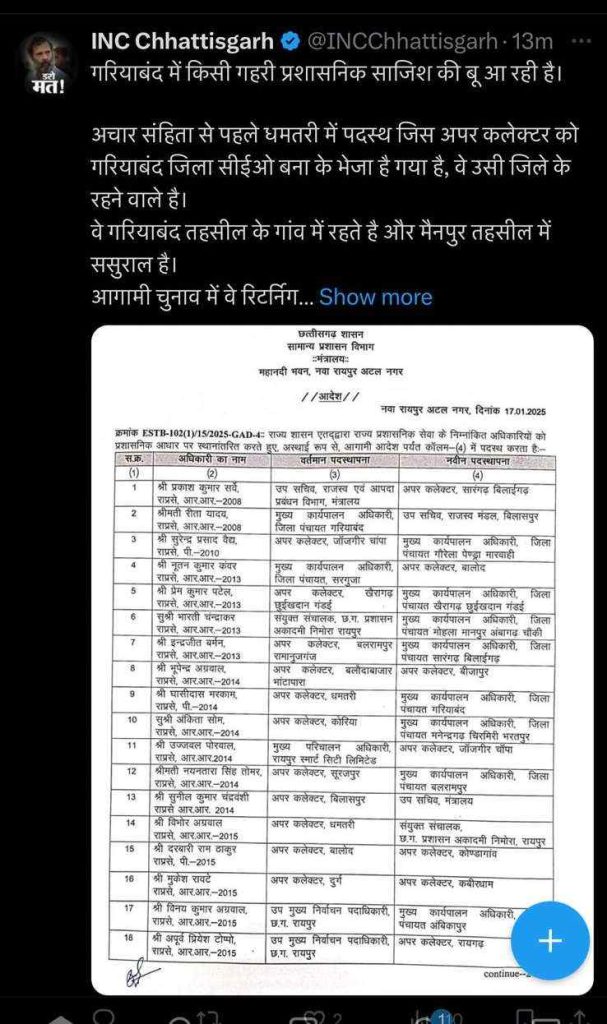 गरियाबंद जिला पंचायत सीईओ की नियुक्ति को लेकर कांग्रेस ने सवाल उठाया था. उन्होंने अपने एक्स पर नियुक्ति का आदेश कॉपी साझा कर गरियाबंद में पंचायती राज चुनाव की निष्पक्षता पर ही सवाल खड़ा किया था. इस आदेश से प्रशासनिक साजिश की बू आने की बात भी कही थी.