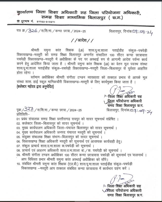 वीरेंद्र गहवई, बिलासपुर। लल्लूराम डॉट कॉम की खबर का बड़ा असर हुआ है। आज जिले के मस्तूरी विकासखंड स्थित पचपेड़ी छात्रावास की समस्याओं को लेकर छात्राओं ने प्रदर्शन किया था। इस खबर को लल्लूराम डॉट कॉम ने प्रमुखता से प्रकाशित किया था। इस पर कार्रवाई करते हुए जिला शिक्षा अधिकारी ने छात्रावास की अधीक्षिका संगीता टंडन को पद से हटा दिया है।