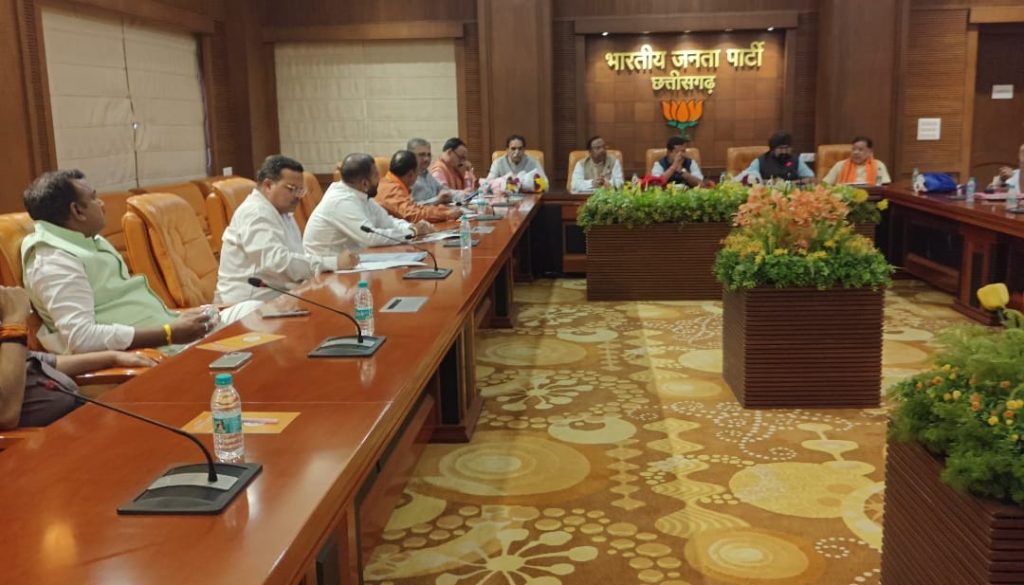 कुशाभाऊ ठाकरे परिसर स्थित भाजपा प्रदेश कार्यालय में हुई इस बैठक में मंत्री रामविचार नेताम, विधायक राजेश मूणत, सुनील सोनी, पुरंदर मिश्रा, प्रदेश उपाध्यक्ष भूपेंद्र सवन्नी, लक्ष्मी वर्मा, प्रदेश कोषाध्यक्ष नंदन जैन, प्रदेश कार्यालय प्रभारी नरेश गुप्ता, प्रदेश मीडिया प्रभारी अमित चिमनानी, सह प्रभारी अनुराग अग्रवाल, प्रदेश प्रवक्ता संदीप शर्मा, दीपक म्हस्के, अमित साहू, जगन्नाथ पाणिग्रही, चंद्रशेखर साहू, सच्चिदानंद उपासने, छगनलाल मूंदड़ा, प्रफुल्ल विश्वकर्मा, श्रीचंद सुंदरानी मौजूद थे.