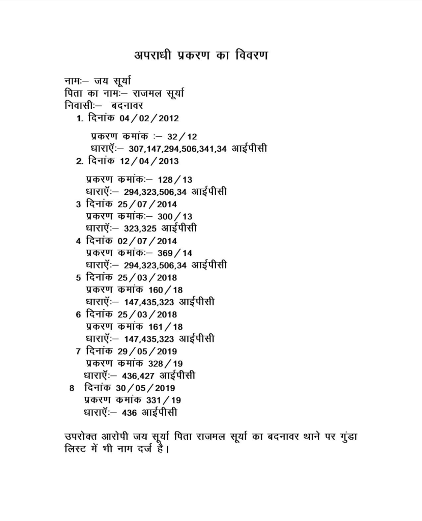 पूर्व मंत्री राजवर्धन सिंह दत्तीगांव ने बिना नाम लिए जय सूर्या पर निशाना साधते हुए कहा कि जिस व्यक्ति को युवा मोर्चा का प्रदेश उपाध्यक्ष बनाया गया है, वह निष्क्रिय रहने के साथ-साथ आपराधिक छवि वाला व्यक्ति है। उन्होंने दावा किया कि इस व्यक्ति पर कई आपराधिक प्रकरण दर्ज हैं और वह पिछले दो वर्षों से जिले की राजनीति से पूरी तरह गायब रहा है।दत्तीगांव ने कहा, “मैंने पार्टी को लिखित शिकायत दे दी है। इसमें उनके क्रियाकलाप, विधानसभा चुनाव में गैरमौजूदगी और आपराधिक रिकॉर्ड का जिक्र किया गया है। यदि जरूरत पड़ी तो थाने से RTI लगाकर उनके और उनके परिवार पर दर्ज प्रकरण निकलवाए जा सकते हैं।”
