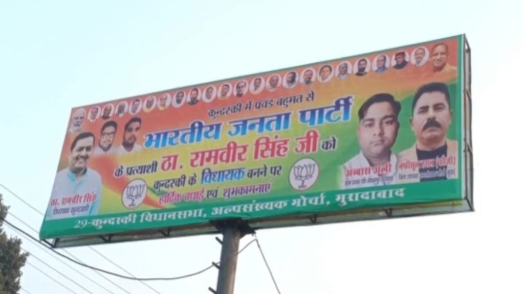 क्षेत्र में मतगणना से पहले ही BJP प्रत्याशी के विधायक बनने के होर्डिंग लगे हुए हैं. जिसमें कार्यकर्ता रामवीर सिंह को विधायक बनने की बधाई दे रहे हैं. ये होर्डिंग मतगणना स्थल से मात्र 200 मीटर दूर लगाया गया है. जिसे आचार संहिता का खुला उल्लंघन माना जा रहा है. और तो और ये होर्डिंग पुलिस के सामने ही लगे हैं. जिसे भाजपा अल्पसंख्यक मोर्चा की ओर से लगाया गया है.