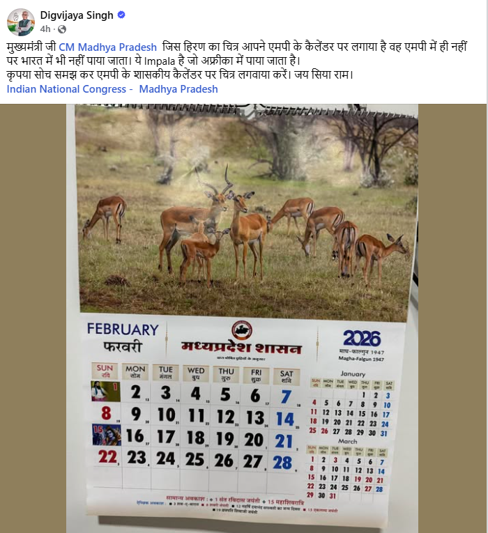 दिग्विजय सिंह ने अपनी पोस्ट में लिखा, “मुख्यमंत्री जी, जिस हिरण का चित्र आपने एमपी के कैलेंडर पर लगाया है वह एमपी में ही नहीं पर भारत में भी नहीं पाया जाता। ये Impala है जो अफ्रीका में पाया जाता है। कृपया सोच-समझ कर एमपी के शासकीय कैलेंडर पर चित्र लगवाया करें। जय सिया राम।”