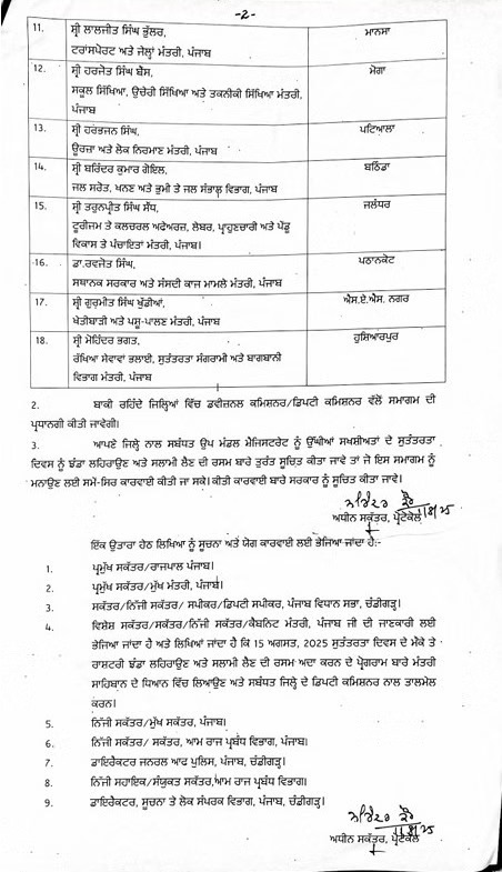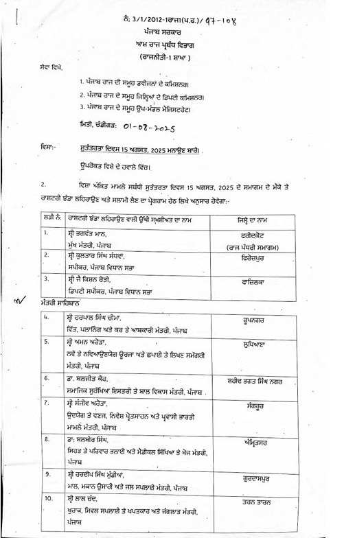 पंजाब के विभिन्न जिलों में 18 नेता तिरंगा फहराएंगे. इस संबंध में पंजाब सरकार ने सभी डिवीजन, डीसी और सब-डिवीजनल मजिस्ट्रेटों को निर्देश जारी किए हैं.