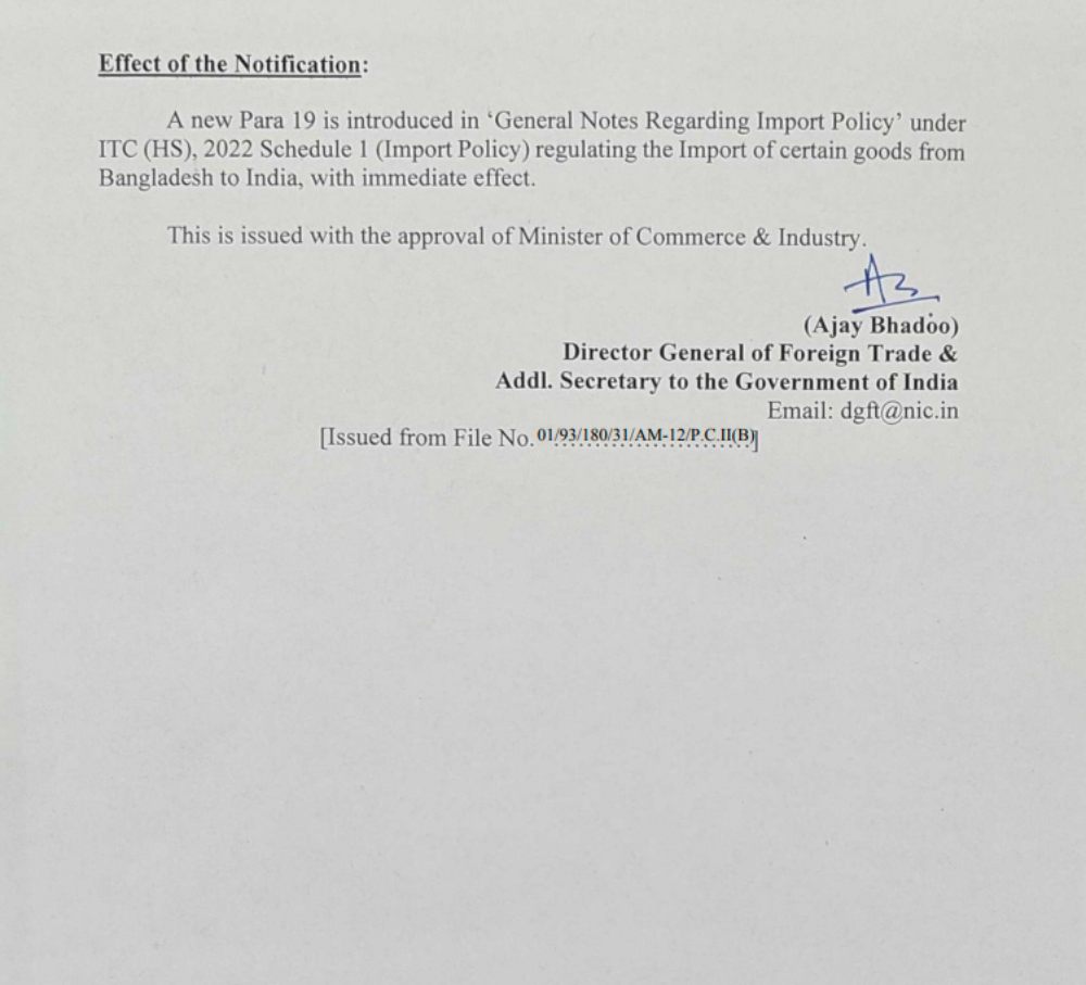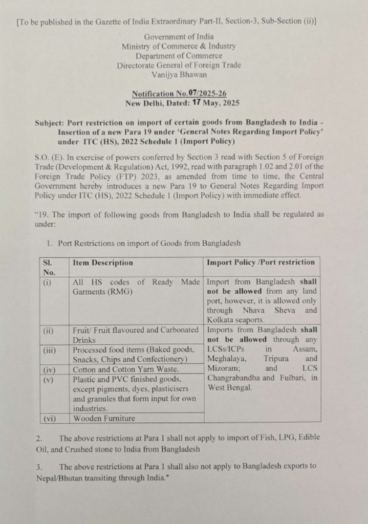 अधिसूचना के अनुसार, बांग्लादेश से तैयार कपड़ों का इंपोर्ट अब केवल न्हावा शेवा और कोलकाता बंदरगाहों के माध्यम से ही किया जा सकेगा, न कि किसी भूमि बंदरगाह के माध्यम से। इसके अतिरिक्त, प्रोसेस्ड फूड, फल और फलों के स्वाद वाले या कार्बोनेटेड पेय, कपास और सूती धागे का वेस्ट, प्लास्टिक और PVC तैयार माल (पिगमेंट, डाई, प्लास्टिसाइज़र जैसे कच्चे इनपुट को छोड़कर) और लकड़ी के फर्नीचर सहित अन्य श्रेणियों के सामानों को भी विशिष्ट बंदरगाह प्रतिबंधों के अंतर्गत लाया गया है।