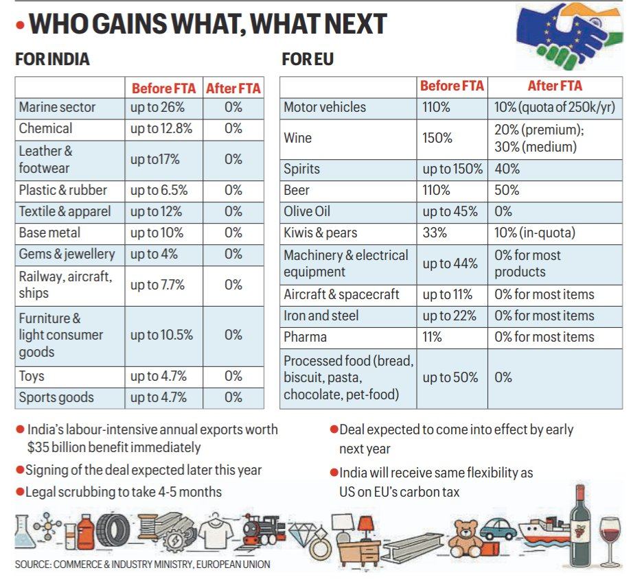इस ग्लोबल चेंज का सबसे बड़ा उदाहरण भारत-यूरोपीय संघ मुक्त व्यापार समझौता है, जिस पर 27 जनवरी 2026 को हस्ताक्षर हुए। यूरोपीय आयोग की अध्यक्ष उर्सुला वॉन डेर लेयेन ने इसे मदर ऑफ ऑल डील्स कहा है. यह समझौता दुनिया की लगभग 25 प्रतिशत ग्लोबल GDP और करीब दो अरब लोगों को जोड़ता है। इसके तहत यूरोपीय संघ भारत को भेजे जाने वाले लगभग 97 प्रतिशत उत्पादों पर टैरिफ घटाएगा या खत्म करेगा, जबकि भारत भी चरणबद्ध तरीके से 93 प्रतिशत यूरोपीय उत्पादों पर टैरिफ हटाएगा। इससे भारत में यूरोपीय कारें, वाइन, चॉकलेट और प्रोसेस्ड फूड सस्ते होंगे, जबकि भारतीय टेक्सटाइल, फार्मा, इंजीनियरिंग और आईटी उत्पादों को यूरोप में बड़ा बाजार मिलेगा।