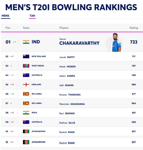 34 वर्षीय वरुण चक्रवर्ती ने पिछले एक साल में टीम इंडिया के लिए टी20 अंतरराष्ट्रीय क्रिकेट में अहम भूमिका निभाई है। अपनी रहस्यमयी गेंदबाजी और विविधताओं से उन्होंने कई बार विरोधी बल्लेबाजों को उलझाया और मैच का रुख पलटने में योगदान दिया। यही प्रदर्शन उन्हें विश्व रैंकिंग में शिखर पर ले आया।